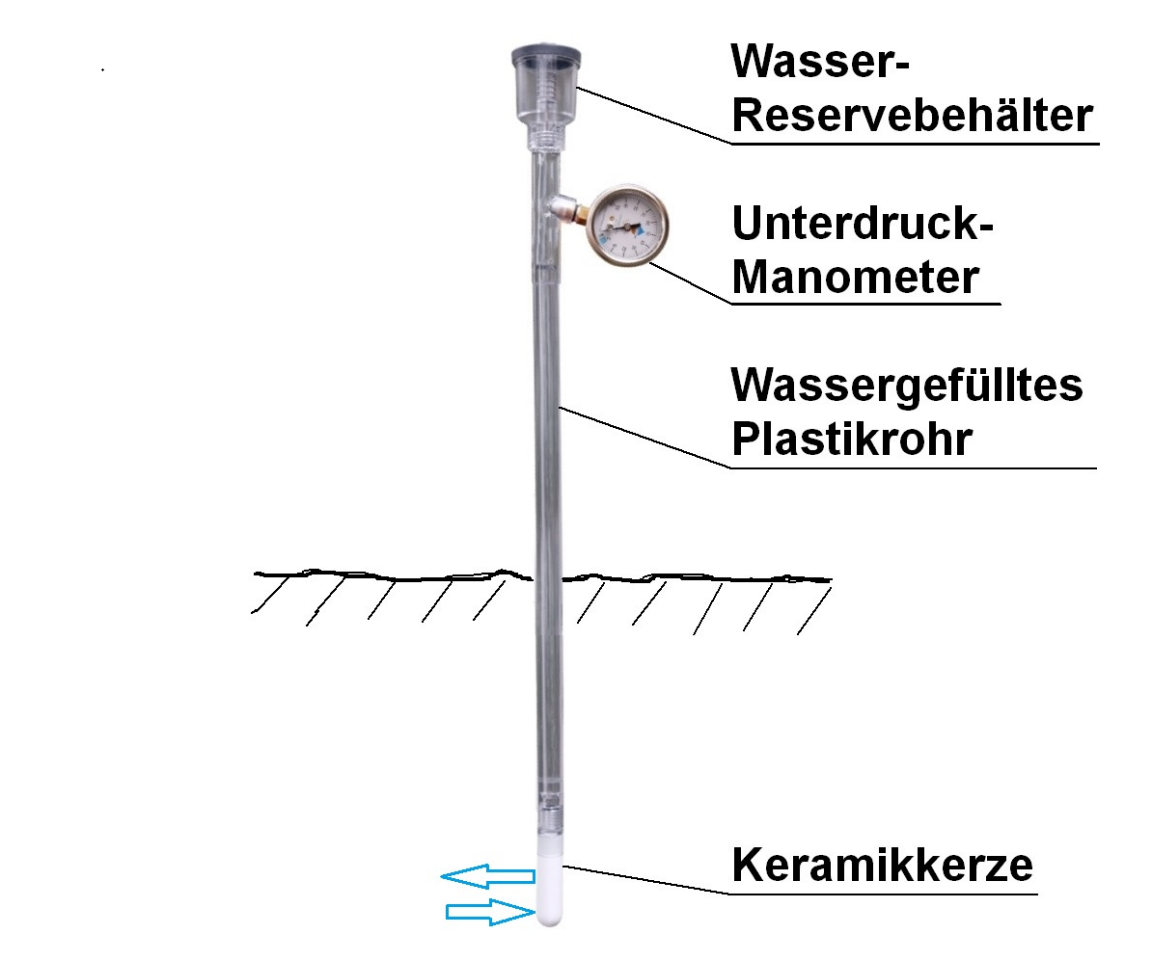In trockenem Boden transportiert die Keramikkerze wegen ihrer Kapillarität Wasser von innen nach aussen, so dass im geschlossenen Rohr ein Unterdruck entsteht. Dieser Unterdruck – die Saugspannung – wird am Manometer abgelesen (grosser Wert = hohe Saugspannung).
