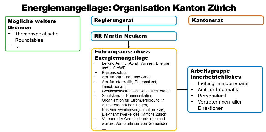 Der Kanton Zürich unterstützt den Bund in der Kommunikation, gibt ergänzende Informationen weiter und ist zuständig für die Krisenbewältigung im Rahmen kantonaler Aufgaben sowie innerhalb der eigenen Betriebe und der Verwaltung. Dazu gehören zum Beispiel die Durchsetzung von Massnahmen oder die Bewältigung der Folgen einer Energiemangellage.