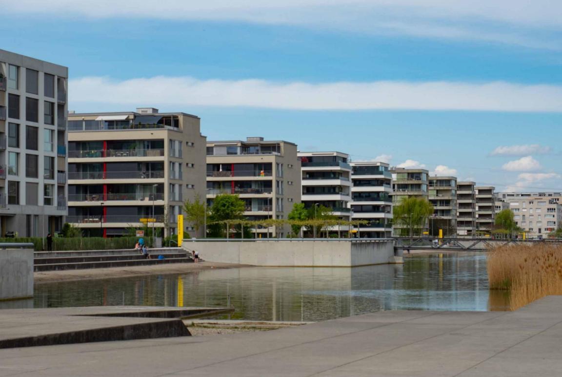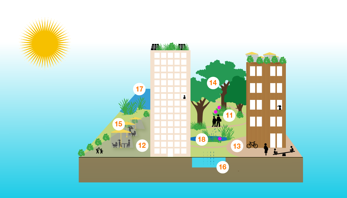 Überbauungen müssen so geplant werden, dass keine Hitzeinseln entstehen. Das Motto heisst: «Mehr Grün und Blau statt Grau». Die klimaangepasste Siedlung von morgen weist viele Bäume und Grünflächen auf und ist mit Wasser durchsetzt.