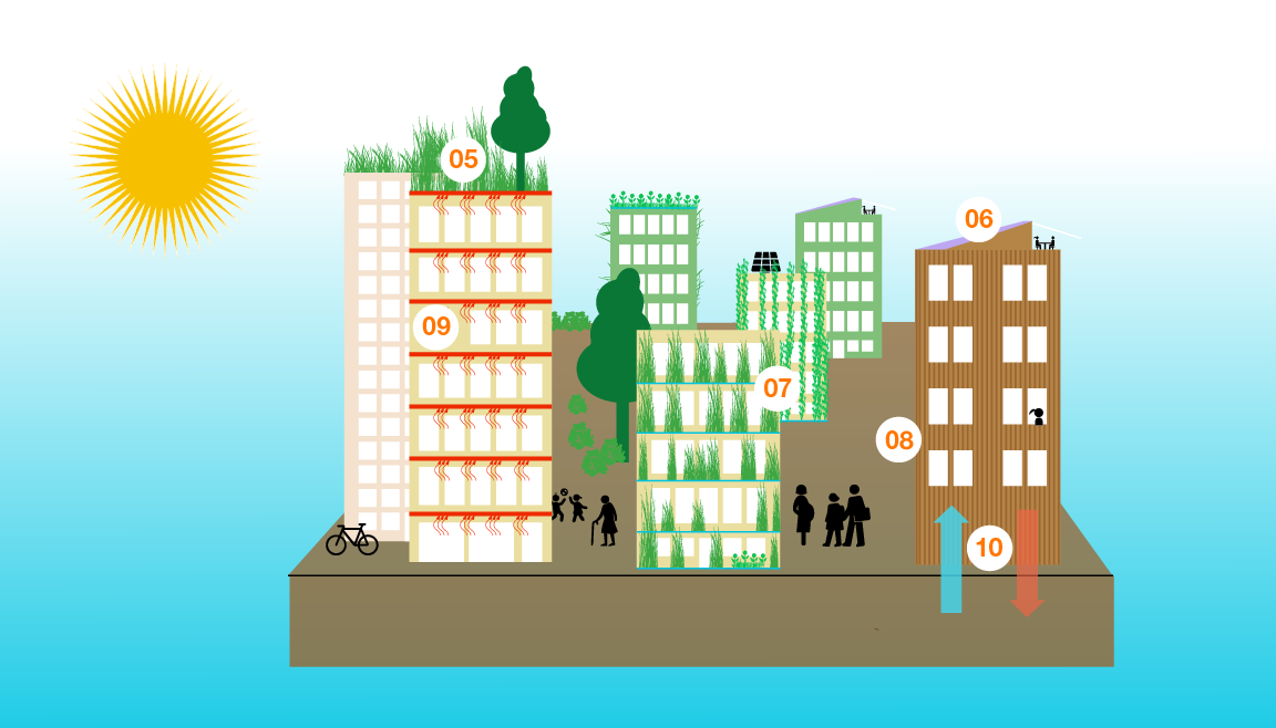 - Materialien und Farben mit hohem Reflexionsgrad (Albedo) und niedriger Wärmekapazität verwenden