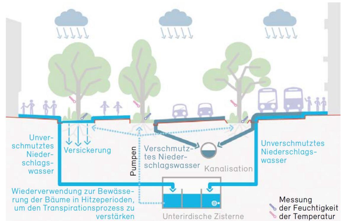 Regenwasser soll auf dem Areal direkt versickern oder es wird zurückgehalten. An Hitzetagen verdunstet das Wasser aus oberirdischen Wasserflächen oder aus dem Boden und wirkt kühlend.