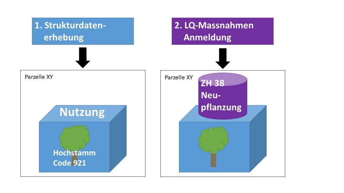 Bisher genügte entweder eine Zurechnungsfläche (ZRF) mit Q2 oder es mussten Strukturen angelegt werden, um den Q2-Beitrag auszulösen. Ab 2025 braucht es für einen Q2-Hochstamm-Obstgarten sowohl eine ZRF als auch Strukturelemente. Die Umsetzung dieser Neuerung ist für alle neuen Verträge verpflichtend. Somit müssen alle Obstgärten, deren Verträge 2017 starteten, bei der 2025 anstehenden Q2-Kontrolle Strukturen aufweisen, um auch weiterhin die Q2-Kriterien zu erfüllen. Für laufende Q2-Verträge ist das Anlegen von Strukturen noch nicht vorgeschrieben, wird aber empfohlen. In welchem Jahr der Q2-Vertrag abläuft, ist im Agriportal unter «Meine Dokumente» im Flächenverzeichnis Kulturen ersichtlich. Ziel dieser Änderung ist, die ökologische Qualität der Hochstamm-Obstgärten und ihrer Umgebung weiter zu erhöhen.