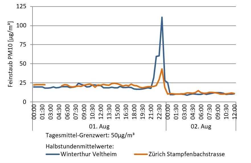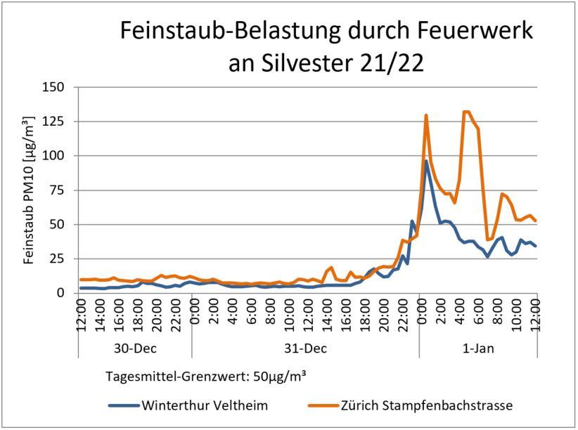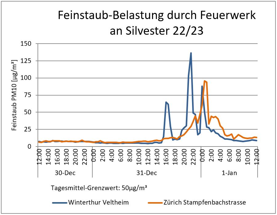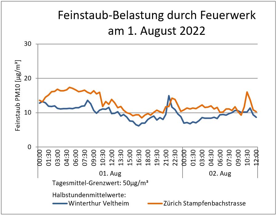 Bei einem grossen Feuerwerk können Spitzenbelastungen durch Feinstaub und Schwefeldioxid auftreten. Es ist möglich, dass die kurzzeitige Feinstaubbelastung durch Feuerwerk lokal zu einer Überschreitung des Tagesmittel-Grenzwertes für Feinstaub PM10 der Luftreinhalteverordnung führt (50 µg/m3 im 24-Stunden Mittel, höchstens drei Überschreitungen pro Jahr sind erlaubt).