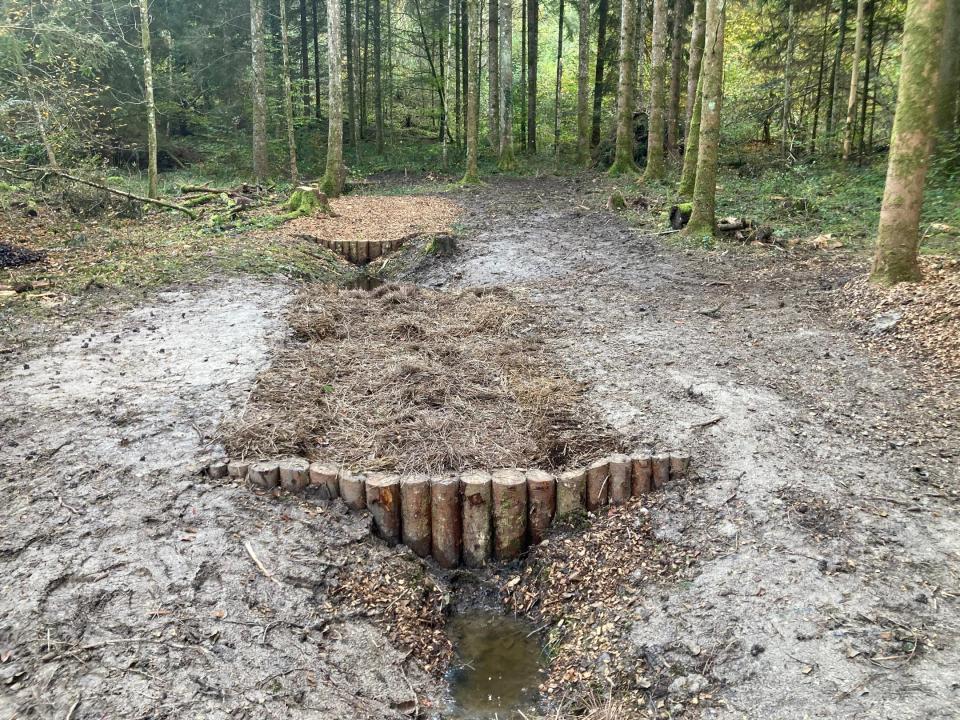 - Stau-Spundungen in zwei tieferen Entwässerungsgräben, teils mit gesägten Brettern, teils mit Stammrundhölzern