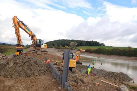 Einbau einer Spundwand zur Abdichtung des neuen Gewässers gegen den Bach. Quelle: Beatrice Vögeli -