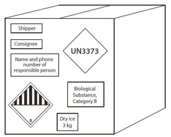 Die Vorgaben an die Markierung des Transportguts werden durch die Klassifizierung der pathogenen oder gentechnisch veränderten Organismen bestimmt. Hier als Beispiel die Markierung eines Pakets mit pathogenen Organismen der Kategorie B, welche mit Trockeneis gekühlt werden.