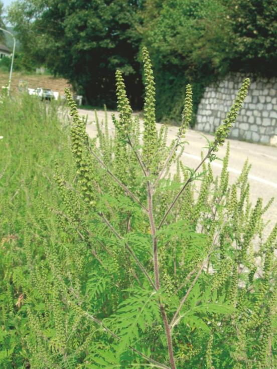 Ambrosia (Ambrosia artemisiifolia) erkennt man an ihren tief eingeschnittenen Blättern und den gelblichen Blütenständen. Die Pollen der Ambrosia können starke Allergien auslösen, die zu Atemnot oder Asthmaanfällen führen. Beim Entfernen schützt man sich am besten mit Handschuhen und während der Blütezeit mit Atemschutz. Die Pflanzen müssen anschliessend zwingend im Kehricht entsorgt werden.