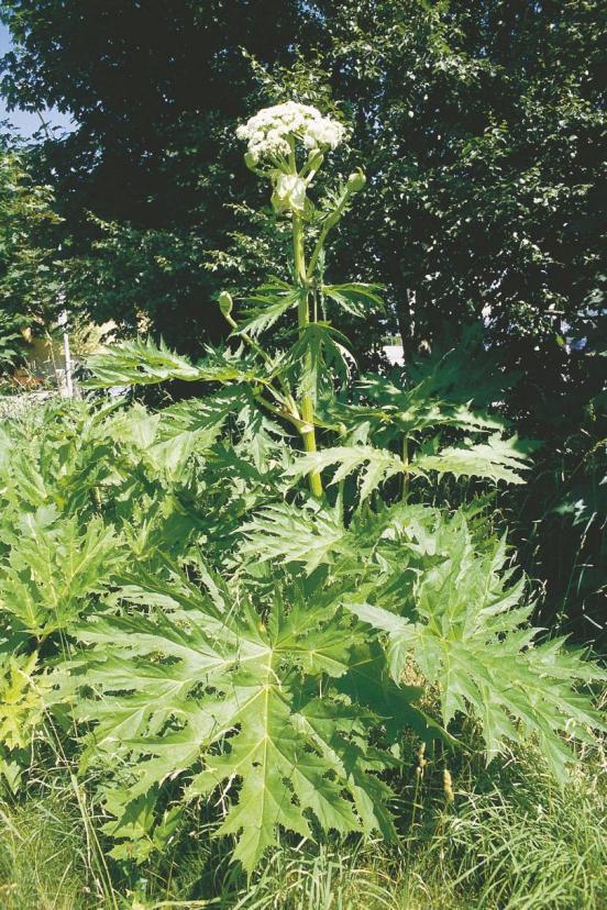 Der Riesenbärenklau (Heracleum mantegazzianum) wird bis zu drei Meter hoch und besitzt grosse gezackte Blätter sowie weisse doldenförmige Blütenstände. Sein Saft verursacht Verbrennungen auf der Haut, wenn diese gleichzeitig oder danach der Sonne ausgesetzt ist. Deshalb empfehlen wir für die Bekämpfung eine Fachperson beizuziehen. Die Pflanzen müssen anschliessend zwingend im Kehricht entsorgt werden.