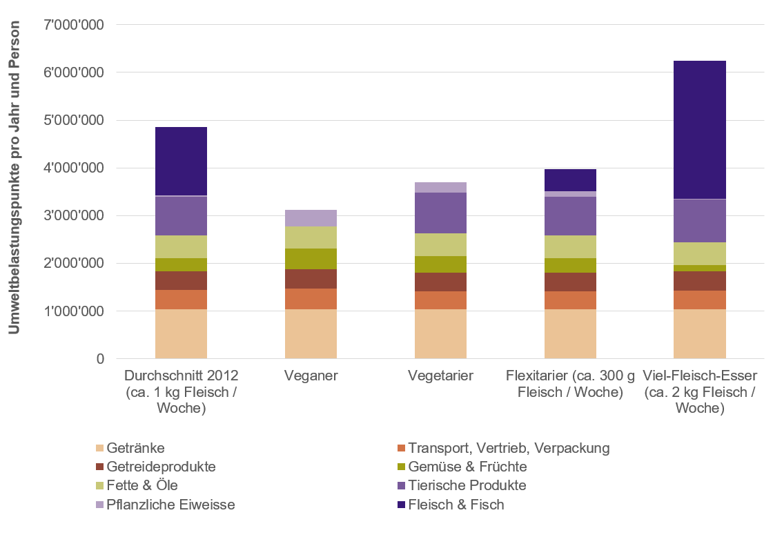 Durch die Wahl von Lebensmitteln mit geringer Umweltwirkung könnte die persönliche Umweltbelastung halbiert werden. Die Herstellung tierischer Produkte ist im Vergleich zur Pflanzenproduktion besonders ressourcen- und energieintensiv. Der Faktor mit dem grössten Einfluss ist der Konsum von Fleischerzeugnissen.
