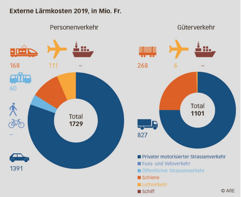 Verkehrslärm führte im Jahr 2019 schweizweit zu Kosten von rund 2,8 Milliarden Franken. Diese setzen sich aus Gesundheitskosten (55%) und Wertverlusten von Liegenschaften (45%) zusammen. Es handelt sich dabei um externe Kosten, die nicht von den Verursachern sondern von der Allgemeinheit getragen werden. Der Strassenverkehr ist für gut 80 Prozent der externen Lärmkosten verantwortlich, gefolgt vom Bahn- (15%) und Flugverkehr (4%).