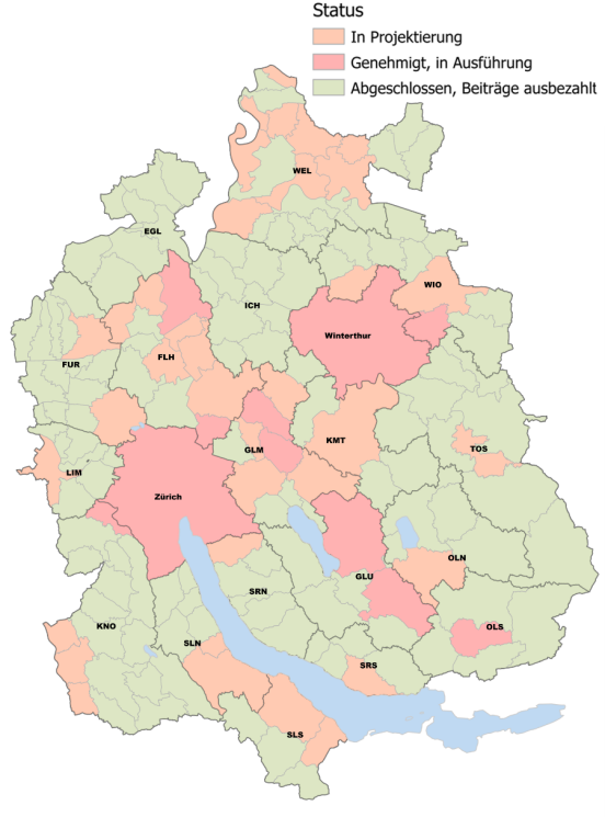 Per Ende 2021 konnten die Arbeiten zur Lärmsanierung entlang der Staatsstrassen in 75 Prozent der Zürcher Gemeinden abgeschlossen werden (siehe Übersicht oben). In 25 Prozent der Gemeinden ist die Lärmsanierung aufgrund von Einsprachen bzw. Abklärungen zu Massnahmen an der Quelle verzögert.