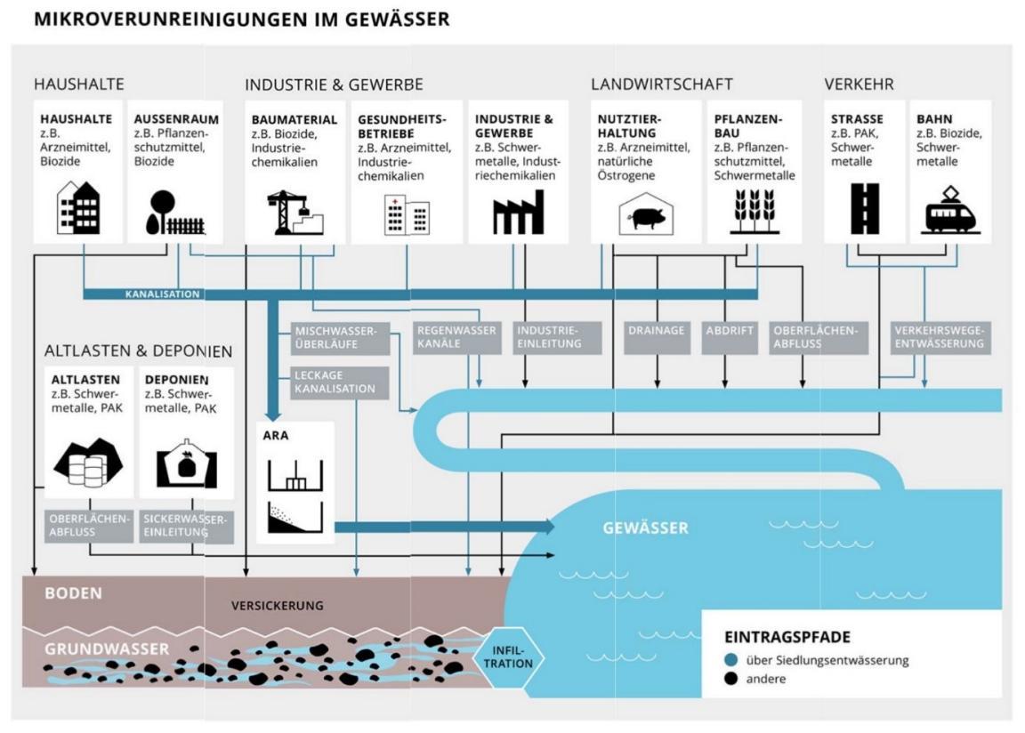 Haushalte, Pflegeeinrichtungen sowie Industrie und Gewerbe tragen ebenfalls zur Belastung mit Mikroverunreinigungen bei. Die Schadstoffe stammen aus Reinigungs- und Desinfektionsmitteln, Medikamenten, Kosmetika oder Korrosionsschutzmitteln. Herkömmliche Abwasserreinigungsanlagen (ARA) können die in diesen Produkten enthaltenen Stoffe oft nicht vollständig abbauen. Problematisch ist z.B. Diclofenac (Schmerzmittel), das bereits in tiefen Konzentrationen giftig für Fische ist.