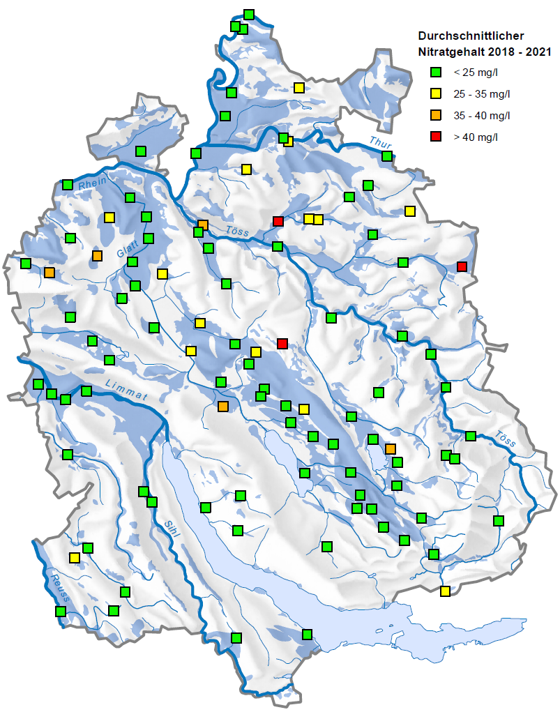 Gründe für Schwankungen der Nitratwerte sind vielfältig und können erheblich sein: Zum Beispiel spielen die Witterungsverhältnisse, die Art der angebauten Kulturen im Einzugsgebiet und die ausgebrachten Düngermengen eine Rolle. Trinkwasserfassungen in landwirtschaftlich intensiv genutzten Gebieten ohne grössere Fliessgewässer (z. B. im Weinland) weisen daher tendenziell höhere Nitratwerte auf und die Werte sind grösseren Schwankungen unterworfen. Grundwasserfassungen im Bereich infiltrierender Oberflächengewässer wie dem Rhein, der Glatt oder Reuss fördern generell ein nitratärmeres Grundwasser.