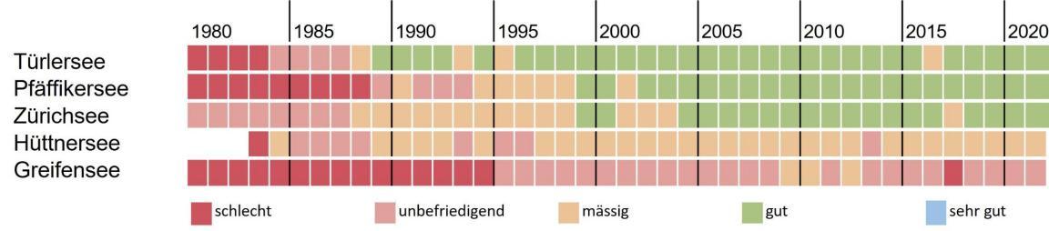 Die Qualität von Seewasser wird massgeblich durch Phosphor beeinflusst. Er gelangt durch Abwasser sowie durch Abschwemmung von Dünger in die Gewässer. Da er das Algenwachstum in Seen reguliert, wurden erhebliche Anstrengungen zur Reduktion der Phosphorbelastung unternommen. Als Folge sanken die Konzentrationen stark. Da in den letzten Jahrzehnten der Nutzungsdruck und die Bevölkerung in den Einzugsgebieten anstiegen, gingen die Konzentrationen jedoch nur noch langsam zurück oder nahmen sogar wieder zu. Heute kann die Phosphorkonzentration im Zürich-, Pfäffiker- und Türlersee als gut beurteilt werden. Im Greifen- und Hüttnersee ist sie nach wie vor zu hoch.