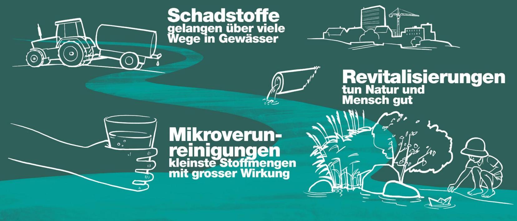 Einige Seen zeigen nach wie vor erhöhte Phosphorkonzentrationen, während Fliessgewässer und Grundwasser durch Nitrat sowie Wirkstoffe aus Pflanzenschutzmitteln aus Landwirtschaft und Siedlungen belastet werden. Viele Fliessgewässer sind aufgrund von Verbauungen in ihren Funktionen beeinträchtigt. Weisen sie einen hohen Abwasseranteil auf, enthält ihr Wasser Schadstoffe aus Haushalten und Industrie. Diverse Massnahmen sollen die Gewässer schützen: Revitalisierungen werten die Gewässer als Lebensräume auf, Verbesserungen in der Landwirtschaft reduzieren den Eintrag von Nährstoffen und Pestiziden, und der Ausbau von Abwasserreinigungsanlagen (ARA) verringert die Belastung durch Abwasser.