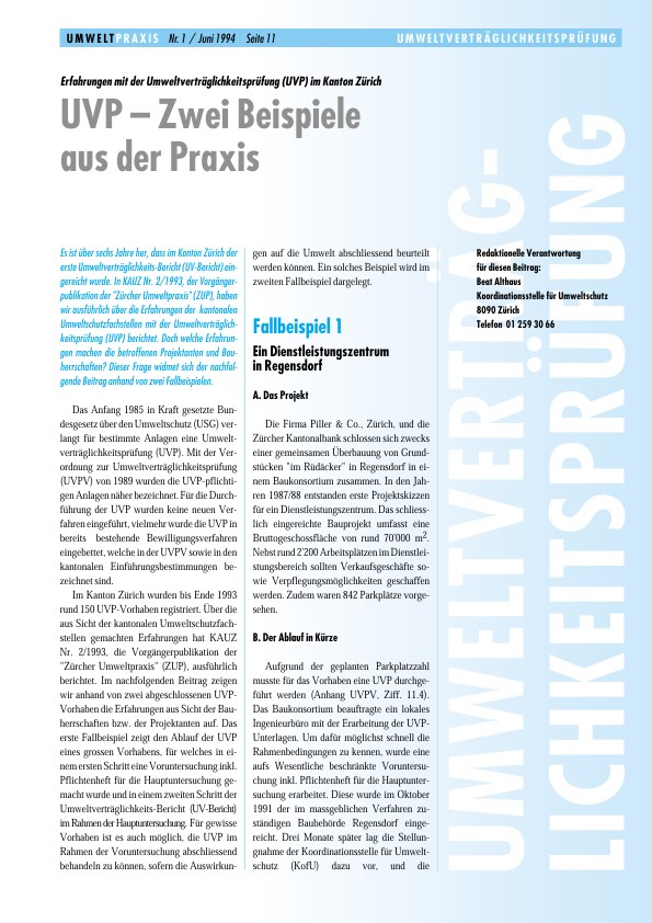 Es ist über sechs Jahre her, dass im Kanton Zürich der erste Umweltverträglichkeits-Bericht (UV-Bericht) eingereicht wurde. In KAUZ Nr. 2, 1993, der Vorgängerpublikation der «Zürcher Umweltpraxis» (ZUP), haben wir ausführlich über die Erfahrungen der kantonalen Umweltschutzfachstellen mit der Umweltverträglichkeitsprüfung (UVP) berichtet. Doch welche Erfahrungen machen die betroffenen Projektanten und Bauherrschaften? Dieser Frage widmet sich der nachfolgende Beitrag anhand von zwei Fallbeispielen.