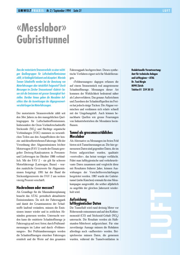 Dass der motorisierte Strassenverkehr zu einer wichtigen Quellengruppen für Luftschadstoffemissionen zählt, ist hinlänglich bekannt und akzeptiert. Wie viele Tonnen Schadstoffe werden bei der Benutzung von Motorfahrzeugen aber tatsächlich freigesetzt? Durch Messungen im Zürcher Strassentunnel «Gubrist» lassen sich die Emissionen mit grosser Genauigkeit feststellen. Darüber hinaus geben die Messdaten Aufschluss über die Auswirkungen der Abgasgrenzwertverschärfungen bei Motorfahrzeugen.
