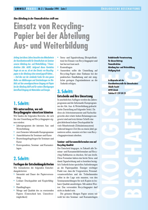 Anfang Juni dieses Jahres besuchte eine Mitarbeiterin der Koordinationsstelle für Umweltschutz ein Seminar unserer Abteilung Aus- und Weiterbildung , Finanzdirektion (Abt. A&W). Aufgrund dieses Kontaktes fragte sie uns an, ob wir den Einsatz von Recyclingpapier in der Abteilung schon einmal geprüft hätten... – Und dies war der zündende Funke für eine ganze Reihe von Abklärungen und Entscheidungen im Hinblick auf den umweltgerechteren Umgang mit Papier bei der Abteilung A&W und für weitere Überlegungen betreffend Umgang mit Materialien und Energie.