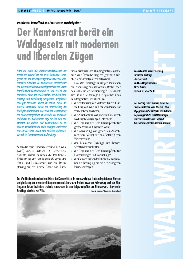 Mitte Juli stellte die Volkswirtschaftsdirektion der Presse den Entwurf für ein neues kantonales Waldgesetz vor, das der Regierungsrat noch vor der Sommerpause zuhanden des Kantonsrates verabschiedet hat. Das neue zürcherische Waldgesetz löst das Gesetz betreffend das Forstwesen vom 28. Juli 1907 ab, das damals vor allem den Wiederaufbau der durch Übernutzung und Plünderung weitgehend aufgelösten oder gar zerstörten Wälder im Kanton Zürich bezweckte. Hauptziele waren die Sicherstellung des künftigen Holzbedarfes, aber auch die Verminderung der Hochwassergefahren im Bereiche der Wildbäche und Flüsse. Der bedrohlichen Lage für den Wald entsprachen die Verbots- und Gebotsnormen an die Adresse der Waldbesitzer. In der heutigen Gesellschaft nun hat der Wald einen ganz anderen Stellenwert, was sich im Gesetzesentwurf niederschlägt.