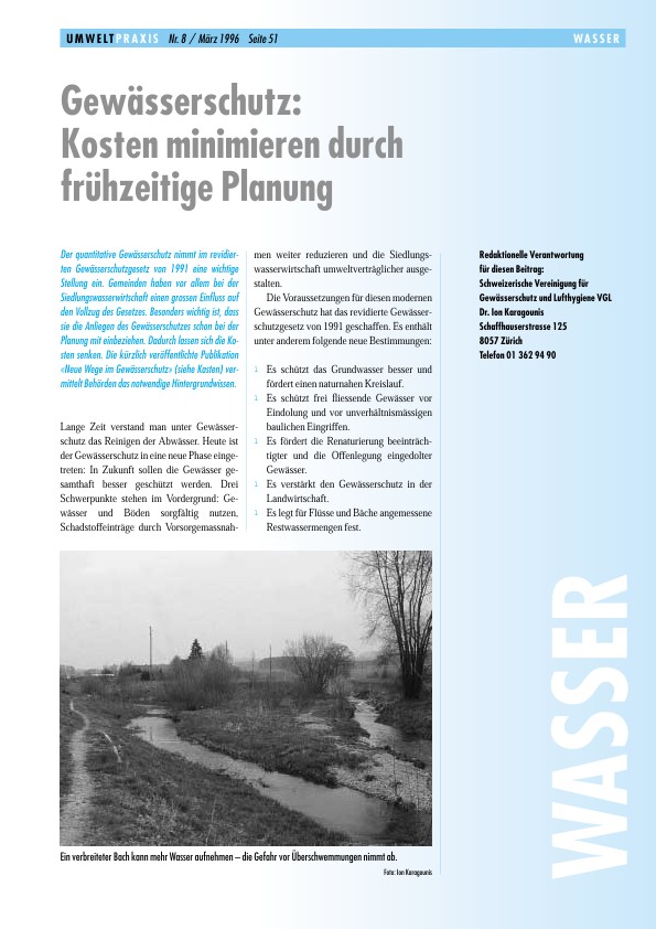 Der quantitative Gewässerschutz nimmt im revidierten Gewässerschutzgesetz von 1991 eine wichtige Stellung ein. Gemeinden haben vor allem bei der Siedlungswasserwirtschaft einen grossen Einfluss auf den Vollzug des Gesetzes. Besonders wichtig ist, dass sie die Anliegen des Gewässerschutzes schon bei der Planung mit einbeziehen. Dadurch lassen sich die Kosten senken. Die kürzlich veröffentlichte Publikation «Neue Wege im Gewässerschutz» (siehe Kasten) vermittelt Behörden das notwendige Hintergrundwissen.
