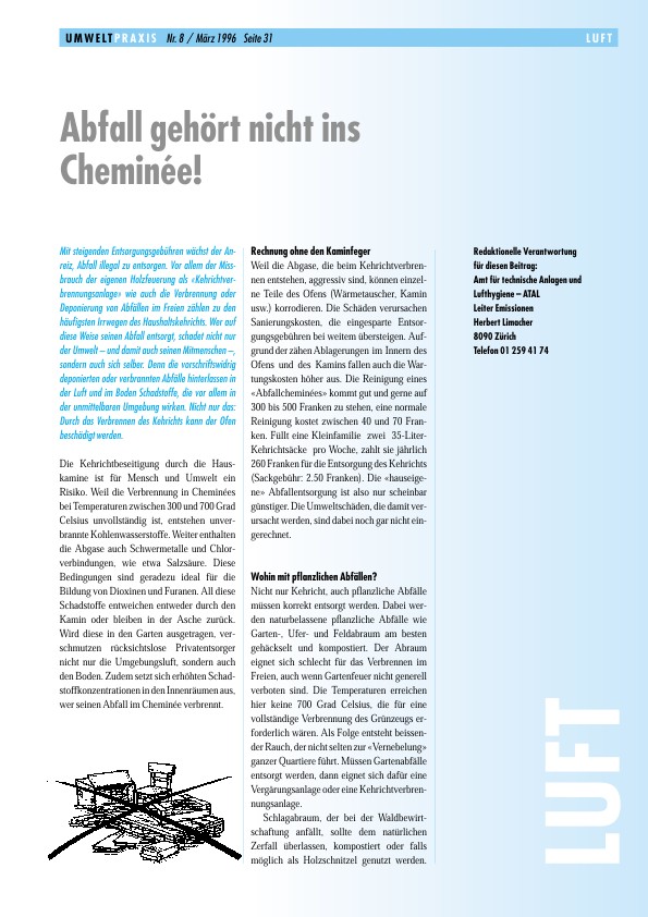 Mit steigenden Entsorgungsgebühren wächst der Anreiz, Abfall illegal zu entsorgen. Vor allem der Missbrauch der eigenen Holzfeuerung als «Kehrichtverbrennungsanlage» wie auch die Verbrennung oder Deponierung von Abfällen im Freien zählen zu den häufigsten Irrwegen des Haushaltskehrichts. Wer auf diese Weise seinen Abfall entsorgt, schadet nicht nur der Umwelt – und damit auch seinen Mitmenschen –, sondern auch sich selber. Denn die vorschriftswidrig deponierten oder verbrannten Abfälle hinterlassen in der Luft und im Boden Schadstoffe, die vor allem in der unmittelbaren Umgebung wirken. Nicht nur das: Durch das Verbrennen des Kehrichts kann der Ofen beschädigt werden.