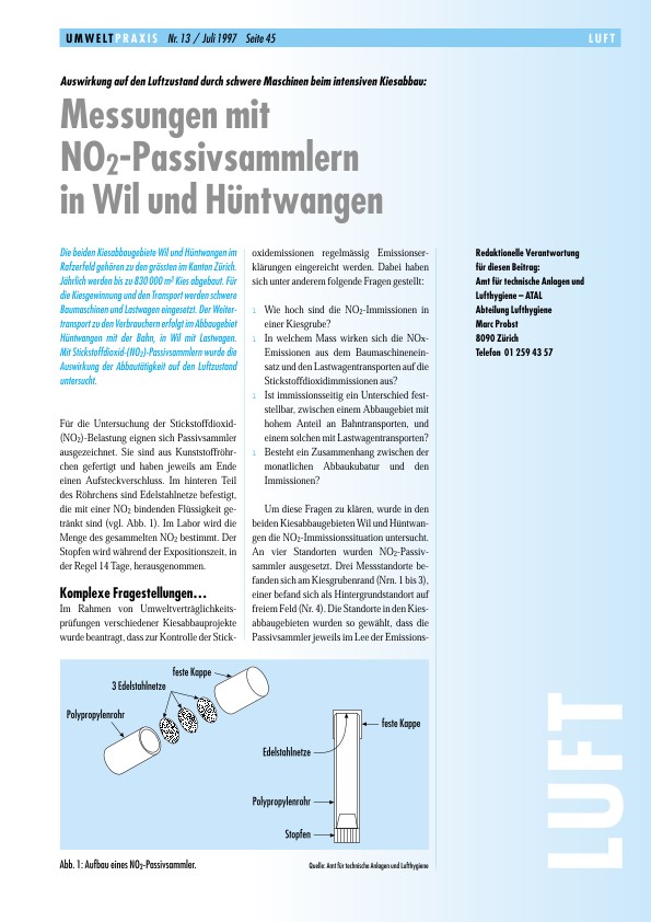 Auswirkung auf den Luftzustand durch schwere Maschinen beim intensiven Kiesabbau: Messungen mit NO2-Passivsammlern in Wil und Hüntwangen