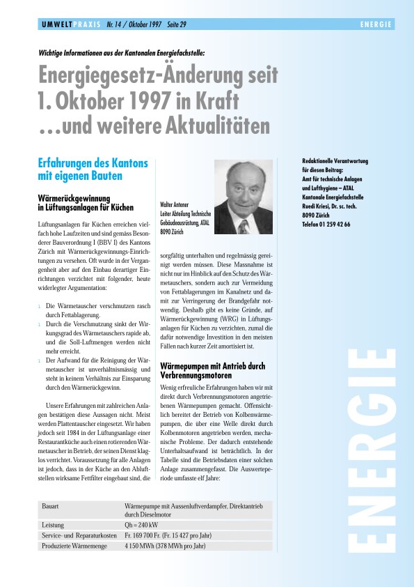 Wichtige Informationen aus der Kantonalen Energiefachstelle: Energiegesetz-Änderung seit 1.Oktober 1997 in Kraft … und weitere Aktualitäten
