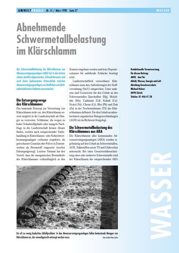 Die Schwermetallbelastung des Klärschlammes aus Abwasserreinigungsanlagen (ARA) hat in den letzten Jahren deutlich abgenommen. Erfreulicherweise sind auch keine bedeutsamen Unterschiede zwischen Abwasserreinigungsanlagen aus ländlichen und dichtindustrialisierten Gebieten auszumachen