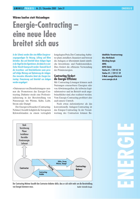 In der Schweiz werden über eine Million Energieversorgungsanlagen für Heizung, Lüftung und Klima betrieben. Bau und Unterhalt dieser Anlagen liegen in der Regel bei den Eigentümern, die dadurch in zweifacher Hinsicht beansprucht werden: finanziell durch die Investitions- und Unterhaltskosten sowie personell infolge Wartung und Optimierung der Anlagen. Eine innovative Alternative bietet das Energie-Contracting: Finanzierung und Unterhalt von Anlagen werden ausgelagert.