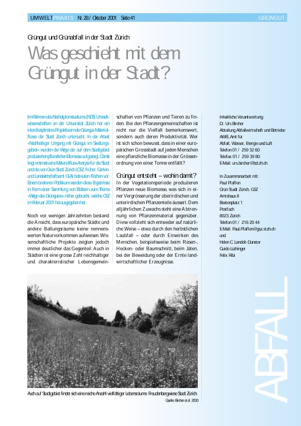Im Rahmen des Nachdiplomstudiums (NDS) Umweltwissenschaften an der Universität Zürich hat ein interdisziplinäres Projektteam die Grüngut-Materialflüsse der Stadt Zürich untersucht. In der Arbeit <Nachhaltiger Umgang mit Grüngut im Siedlungsgebiet> wurden die Wege der auf dem Stadtgebiet produzierten pflanzlichen Biomasse aufgezeigt. Damit liegt erstmals eine Materialfluss-Analyse für die Stadt und die von Grün Stadt Zürich (GSZ; früher Garten- und Landwirtschaftsamt GLA) betreuten Flächen vor. Einem breiteren Publikum werden diese Ergebnisse in Form einer Sammlung von Blättern zum Thema <Wege des Grüngutes> näher gebracht, welche GSZ im Februar 2001 herausgegeben hat.