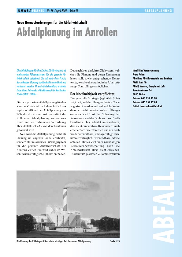 Die Abfallplanung für den Kanton Zürich wird neu als umfassendes Führungssystem für die gesamte Abfallwirtschaft aufgebaut. Sie soll nach dem Prinzip der rollenden Planung kontinuierlich entwickelt und verbessert werden. Als erste Zwischenbilanz erscheint Ende dieses Jahres das «Abfallkonzept für den Kanton Zürich 2002...2006».
