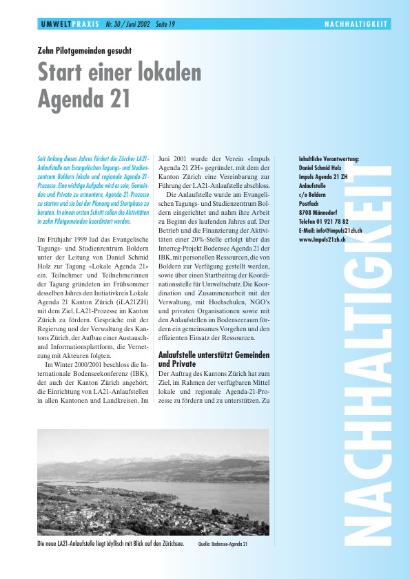 Seit Anfang dieses Jahres fördert die Zürcher LA21-Anlaufstelle am Evangelischen Tagungs- und Studienzentrum Boldern lokale und regionale Agenda-21-Prozesse. Eine wichtige Aufgabe wird es sein, Gemeinden und Private zu ermuntern, Agenda-21-Prozesse zu starten und sie bei der Planung und Startphase zu beraten. In einem ersten Schritt sollen die Aktivitäten in zehn Pilotgemeinden koordiniert werden.