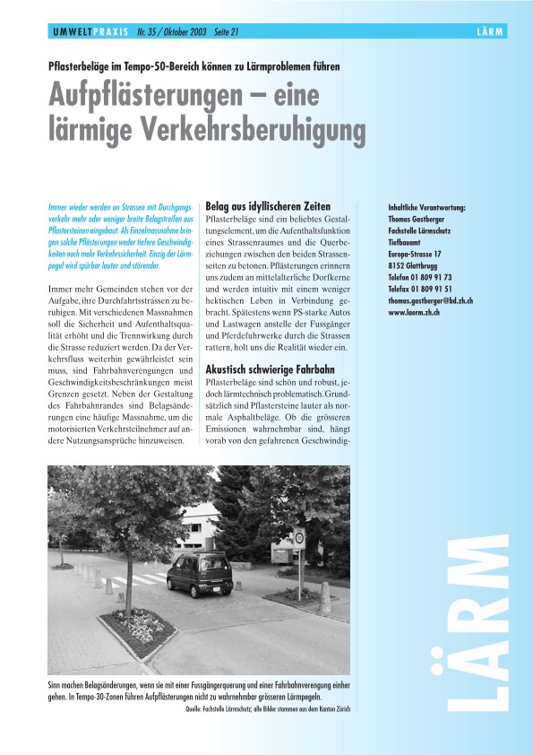 Immer wieder werden an Strassen mit Durchgangsverkehr mehr oder weniger breite Belagstreifen aus Pflastersteinen eingebaut. Als Einzelmassnahme bringen solche Pflästerungen weder tiefere Geschwindigkeiten noch mehr Verkehrssicherheit. Einzig der Lärmpegel wird spürbar lauter und störender.
