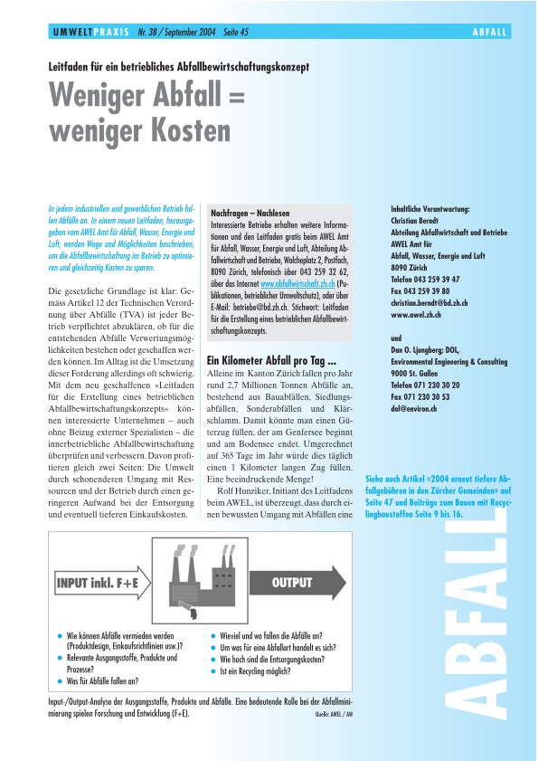 In jedem industriellen und gewerblichen Betrieb fallen Abfälle an. In einem neuen Leitfaden, herausgegeben vom AWEL Amt für Abfall, Wasser, Energie und Luft, werden Wege und Möglichkeiten beschrieben, um die Abfallbewirtschaftung im Betrieb zu optimieren und gleichzeitig Kosten zu sparen.