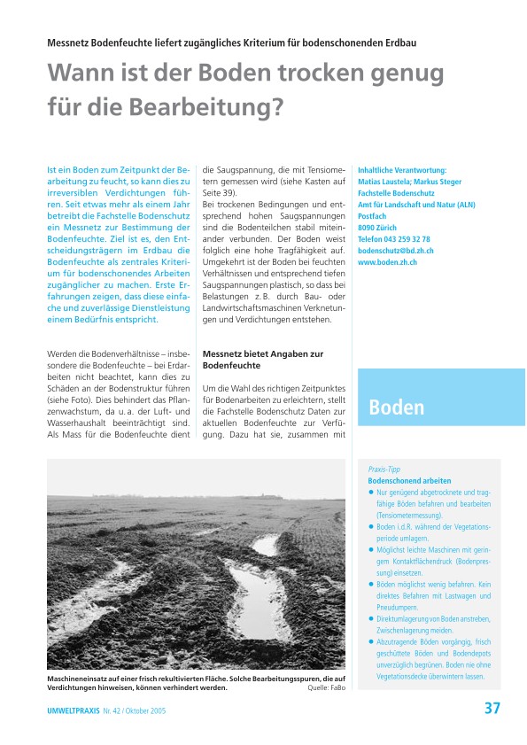 Ist ein Boden zum Zeitpunkt der Bearbeitung zu feucht, so kann dies zu irreversiblen Verdichtungen führen.Seit etwas mehr als einem Jahr betreibt die Fachstelle Bodenschutz ein Messnetz zur Bestimmung der Bodenfeuchte. Ziel ist es, den Entscheidungsträgern im Erdbau die Bodenfeuchte als zentrales Kriterium für bodenschonendes Arbeiten zugänglicher zu machen. Erste Erfahrungen zeigen, dass diese einfache und zuverlässige Dienstleistung einem Bedürfnis entspricht.