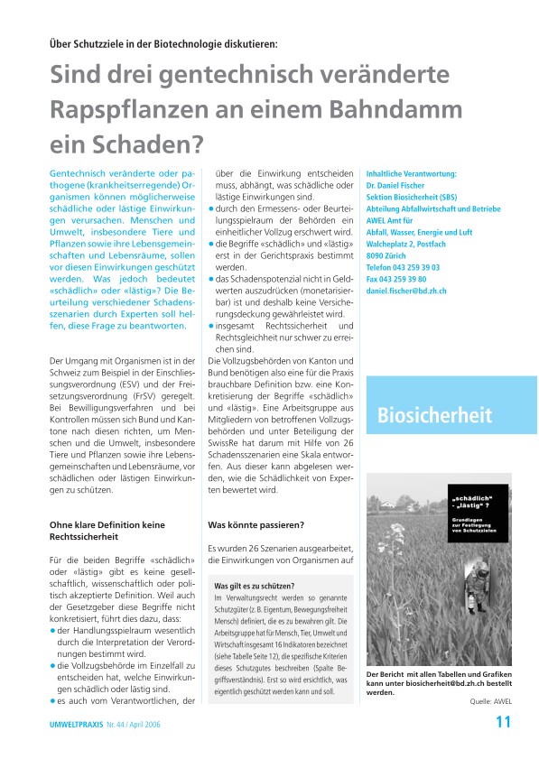 Gentechnisch veränderte oder pathogene (krankheitserregende) Organismen können möglicherweise schädliche oder lästige Einwirkungen verursachen. Menschen und Umwelt, insbesondere Tiere und Pflanzen sowie ihre Lebensgemeinschaften und Lebensräume, sollen vor diesen Einwirkungen geschützt werden. Was jedoch bedeutet «schädlich» oder «lästig»? Die Beurteilung verschiedener Schadensszenarien durch Experten soll helfen, diese Frage zu beantworten.