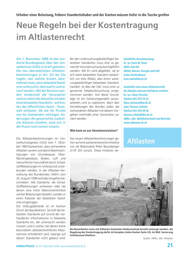 Am 1. November 2006 ist das revidierte Bundesgesetz über den Umweltschutz (USG) in Kraft getreten. Die neu überarbeiteten Altlastenbestimmungen in Art. 32c bis 32e regeln, wer welche Kosten übernehmen muss, wenn belastete Standorte untersucht, überwacht und saniert werden. Mit der Revision werden tendenziell die Verursacher und vor allem die aktuellen Inhaber eines belasteten Standorts – auf Kosten der öffentlichen Hand – finanziell entlastet. Ob die für Private wie für Gemeinden wichtigen Änderungen die gewünschte zusätzliche Klarheit schaffen, wird sich in der Praxis noch weisen müssen.