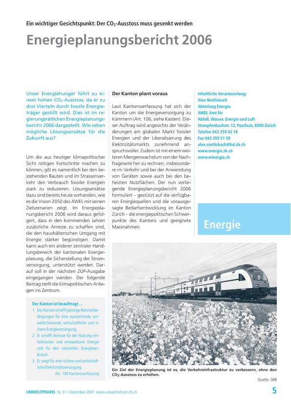 Unser Energiehunger führt zu einem hohen CO2-Ausstoss, da er zu drei Vierteln durch fossile Energieträger gestillt wird. Dies ist im regierungsrätlichen Energieplanungsbericht 2006 dargestellt. Wie sehen mögliche Lösungsansätze für die Zukunft aus?