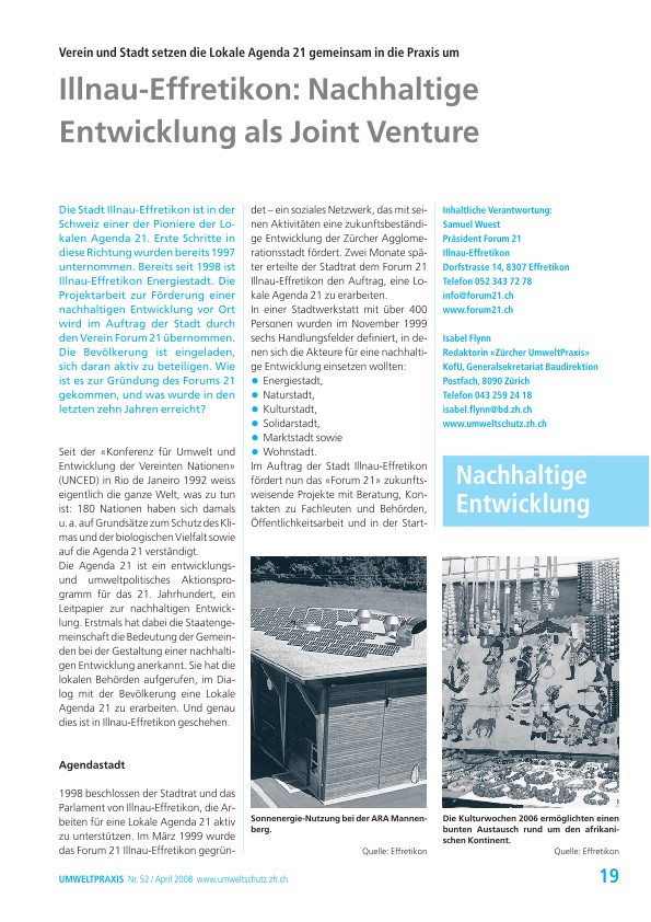 Die Stadt Illnau-Effretikon ist in der Schweiz einer der Pioniere der Lokalen Agenda 21. Erste Schritte in diese Richtung wurden bereits 1997 unternommen. Bereits seit 1998 ist Illnau-Effretikon Energiestadt. Die Projektarbeit zur Förderung einer nachhaltigen Entwicklung vor Ort wird im Auftrag der Stadt durch den Verein Forum 21 übernommen. Die Bevölkerung ist eingeladen, sich daran aktiv zu beteiligen. Wie ist es zur Gründung des Forums 21 gekommen, und was wurde in den letzten zehn Jahren erreicht?
