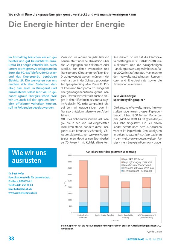 Im Büroalltag brauchen wir ein geheiztes und gut beleuchtetes Büro. Dafür ist Energie erforderlich. Auch unsere wichtigsten Arbeitsgeräte im Büro, der PC, das Telefon, der Drucker und das Kopiergerät, benötigen Elektrizität. Die wenigsten von uns machen sich aber Gedanken da r - über, dass auch im Bürogerät und Büromaterial selbst sehr viel so genannt «graue Energie» steckt. Wie wir uns auch bei der «grauen Energie » effizienter verhalten können, soll im Folgenden gezeigt werden.