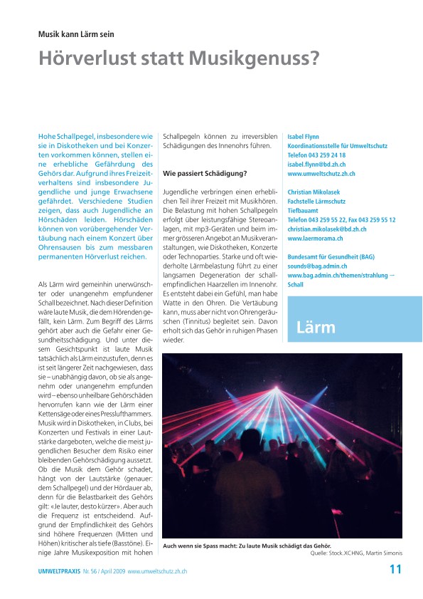 Hohe Schallpegel, insbesondere wie sie in Diskotheken und bei Konzerten vorkommen können, stellen eine erhebliche Gefährdung des Gehörs dar. Aufgrund ihres Freizeitverhaltens sind insbesondere Jugendliche und junge Erwachsene gefährdet. Verschiedene Studien zeigen, dass auch Jugendliche an Hörschäden leiden. Hörschäden können von vorübergehender Vertäubung nach einem Konzert über Ohrensausen bis zum messbaren permanenten Hörverlust reichen.
