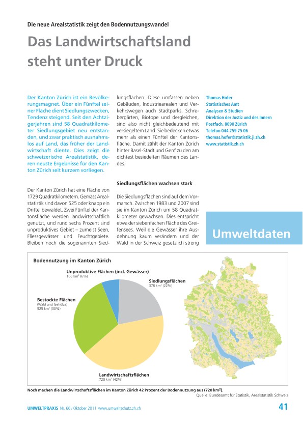 Der Kanton Zürich ist ein Bevölkerungsmagnet. Über ein Fünftel seiner Fläche dient Siedlungszwecken, Tendenz steigend. Seit den Achtzigerjahren sind 58 Quadratkilometer Siedlungsgebiet neu entstanden, und zwar praktisch ausnahmslos auf Land, das früher der Landwirtschaft diente. Dies zeigt die schweizerische Arealstatistik, deren neuste Ergebnisse für den Kanton Zürich seit kurzem vorliegen.