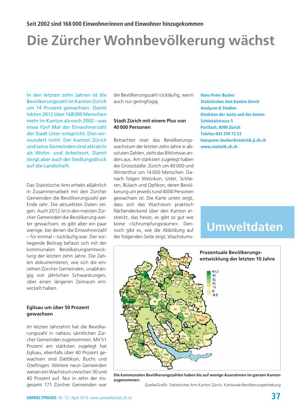 In den letzten zehn Jahren ist die Bevölkerungszahl im Kanton Zürich um 14 Prozent gewachsen. Damit lebten 2012 über 168000 Menschen mehr im Kanton als noch 2002 – was etwa fünf Mal der Einwohnerzahl der Stadt Uster entspricht. Dies verwundert nicht: Der Kanton Zürich und seine Gemeinden sind attraktiv als Wohn- und Arbeitsort. Damit steigt aber auch der Siedlungsdruck auf die Landschaft.