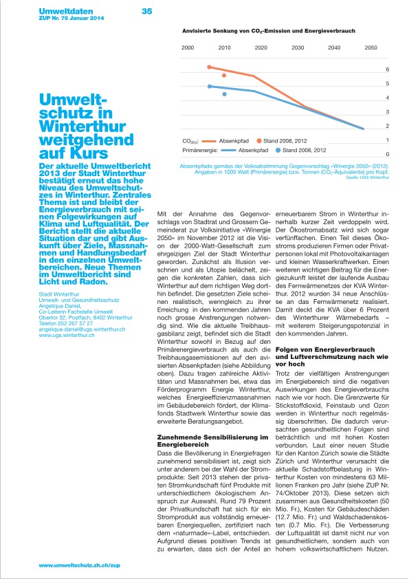 Der aktuelle Umweltbericht 2013 der Stadt Winterthur bestätigt erneut das hohe Niveau des Umweltschutzes in Winterthur. Zentrales Thema ist und bleibt der Energieverbrauch mit seinen Folgewirkungen auf Klima und Luftqualität. Der Bericht stellt die aktuelle Situation dar und gibt Auskunft über Ziele, Massnahmen und Handlungsbedarf in den einzelnen Umweltbereichen Neue Themen im Umweltbericht