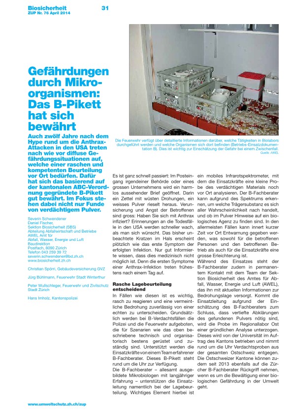 Auch zwölf Jahre nach dem Hype rund um die Anthrax-Attacken in den USA treten nach wie vor diffuse Gefährdungssituationen auf, welche einer raschen und kompetenten Beurteilung vor Ort bedürfen. Dafür hat sich das basieren auf der kantonal ABC-Verordnung gegründeze B-Pikett gut bewährt. Im Fokkus stehen dabei nicht nur Funde von verdächtigem Pulver.