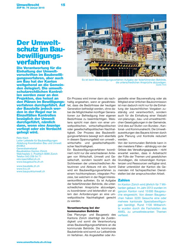 Die Verantwortung für die Einhaltung der Umweltvorschriften im Baubewilligungsverfahren, aber auch am Bau hat der Kanton weitgehend an die emeinden delegiert. Die umweltschutzrechtlichen Kontrollen werden zwar an den Projekten, das heisst an den Plänen im Bewilligungsverfahren durchgeführt. Auf der Baustelle jedoch werden in der Regel nur in Einzelfällen Kontrollen bezüglich der Umwelt durchgeführt, nämlich dann, wenn eine Anzeige vorliegt oder ein Verdacht gehegt wird.