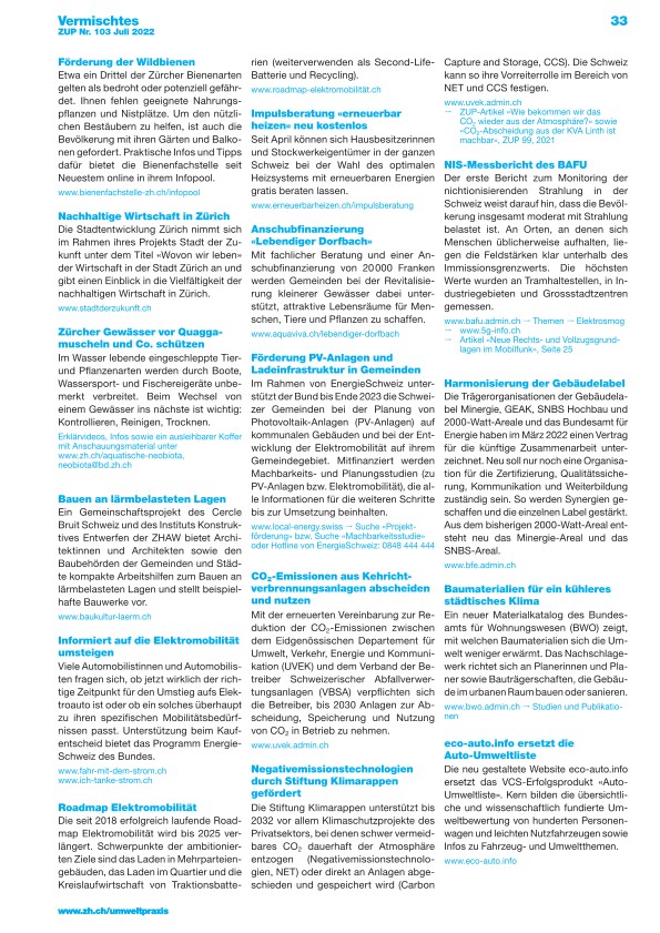 Zürcher Umweltpraxis und Raumentwicklung 103: Vermischte Hinweise zu verschiedenen Umweltthemen