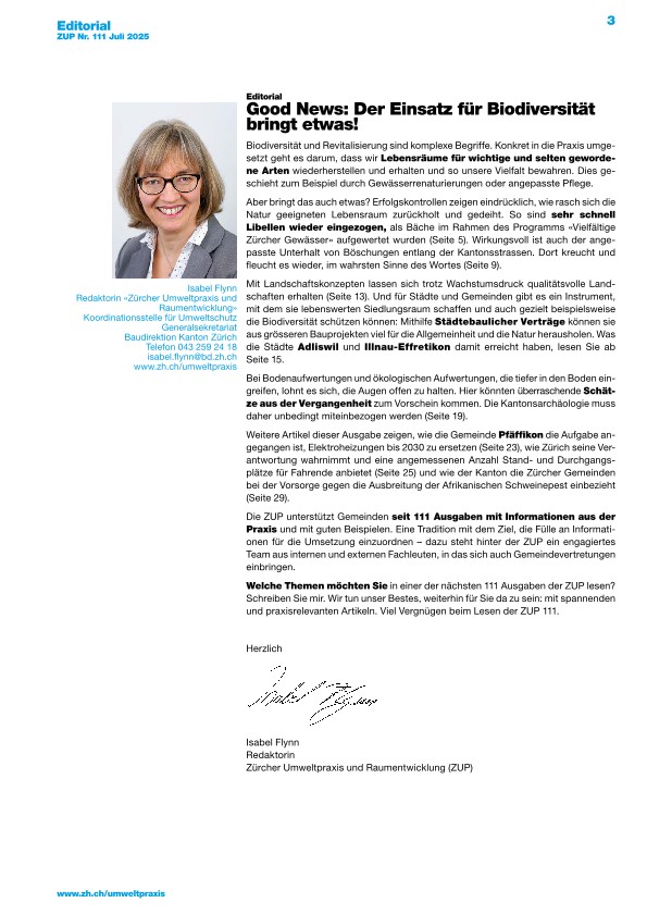 Der Einsatz für Biodiversität bringt etwas! Etwa durch Gewässerrenaturierungen oder angepasste Pflege von Böschungen. Mit Landschaftskonzepten lassen sich qualitätsvolle Landschaften erhalten. Und für Städte und Gemeinden können mit städtebaulichen Verträgen lebenswerten Siedlungsraum schaffen. Bei Bodenaufwertungen und ökologischen Aufwertungen, können überraschende Schätze aus der Vergangenheit auftauchen. Weitere Themen: Elektroheizungen sind bis 2030 zu ersetzen, Stand- und Durchgangsplätze für Fahrende in Zürich, Vorsorge gegen die Afrikanische Schweinegrippe.