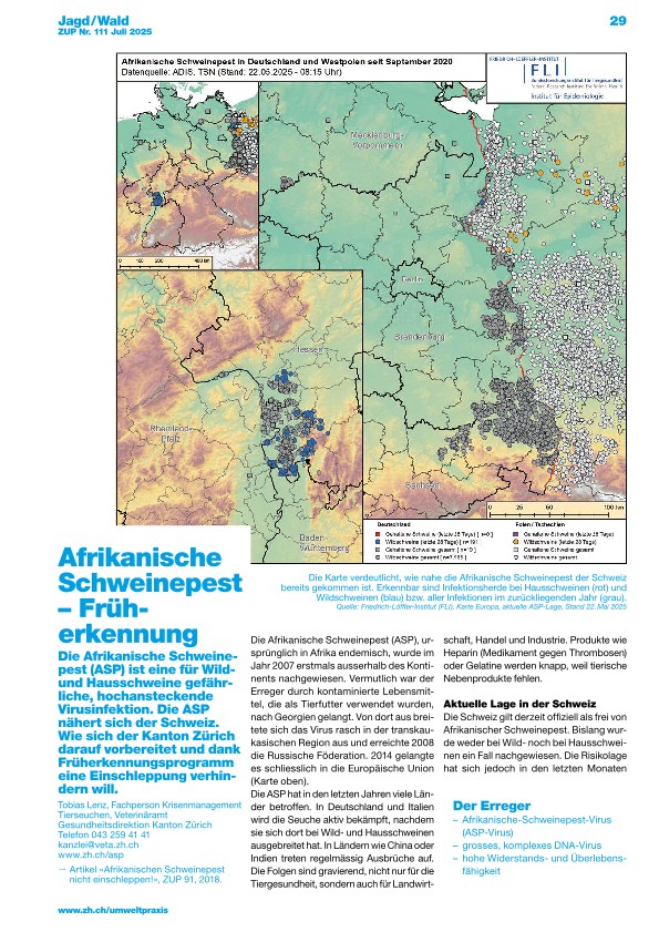 Die Afrikanische Schweinepest (ASP) ist eine für Wild- und Hausschweine gefährliche, hochansteckende Virusinfektion. Die ASP nähert sich der Schweiz. Wie sich der Kanton Zürich darauf vorbereitet und dank Früherkennungsprogramm eine Einschleppung verhindern will.