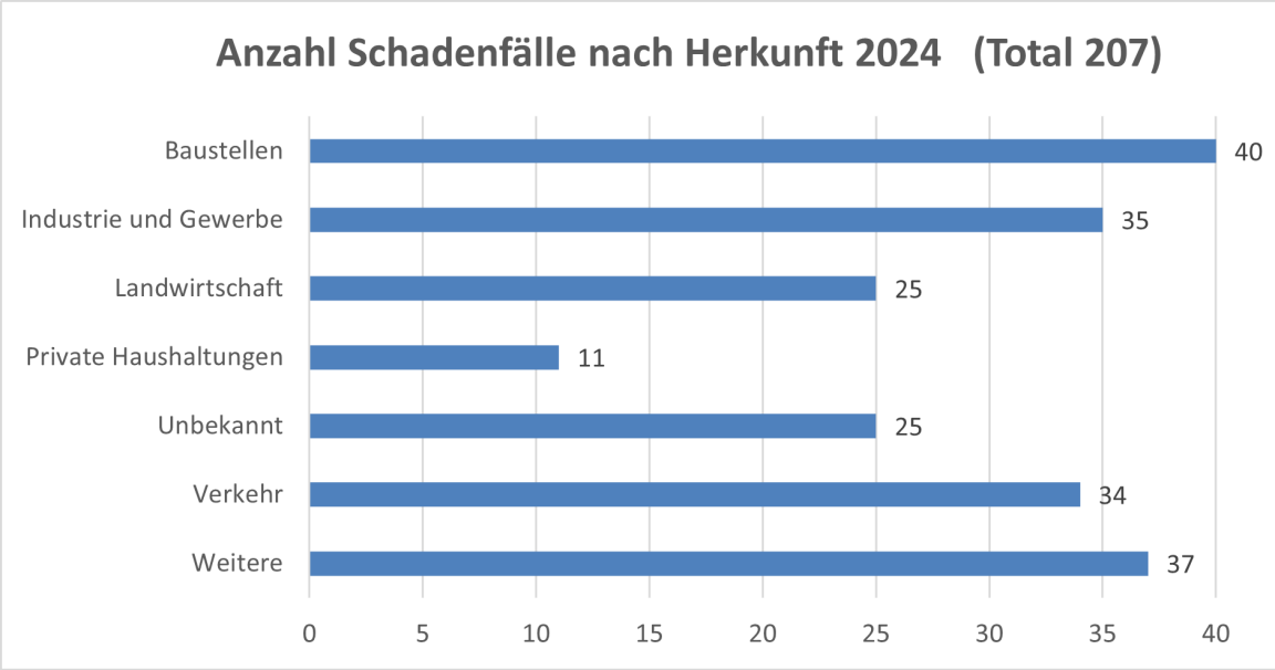 Die häufigsten Ursachen für Gewässer- und Bodenverschmutzungen sind in nachfolgender Grafik für das Jahr 2024 dargestellt.